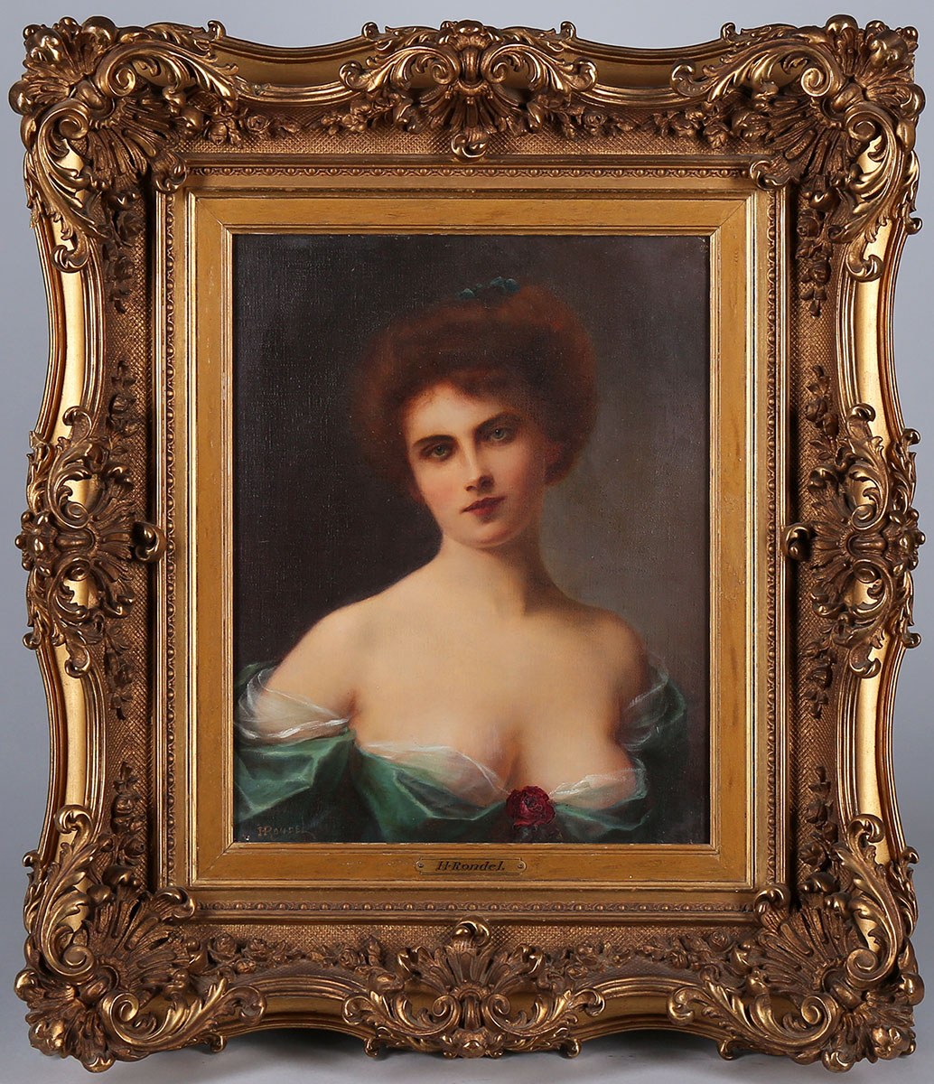 On offer is a spectacularly erotic French pre-pin up portrait of a Victorian redheaded maiden in very low cut gown by Henri Rondel. The artist was known for his sumptuous portraiture that juxtaposed the refined faces of French beauties with states of shocking undress. This example was acquired by the Osborne Art Company for use in a calendar circa 1905-1910. The verso of the canvas and stretcher bars show Osborne inventory sticker and numbering system. Please note: the item # Osborne used is 1917, that does not refer to a year.