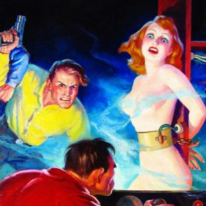 A tense and clever, menace-themed, rare surviving cover painting for the January 1939 issue of Double Action Detective.. A Science Fiction/Spicy Pulp epic entanglement illustrating George Alden Edson’s story, The Midnight Murderer. This original oil-on-canvas painting is unsigned, we are of the strong belief that it was done Rudolph Zirm. A xeroxed color print of the pulp magazine cover proof is included in the sale.